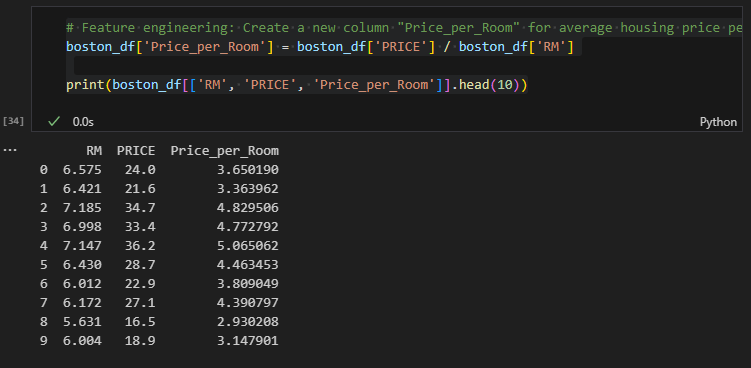 In this example, we calculated the "Price_per_Room" by dividing the "PRICE" column (housing price) by the "RM" column (number of rooms) for each property. This creates a new column that indicates the average housing price per room in the property. This numerical variable can provide valuable insights into how the housing prices are affected by the number of rooms available.