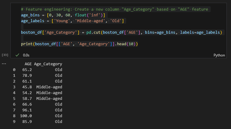 In this example, we used the pd.cut() function from Pandas to create the new "Age_Category" column based on the "AGE" feature. We defined the age bins as [0, 30, 60, float('inf')], corresponding to "Young", "Middle-aged", and "Old" age categories, respectively. The labels assigned to these categories are 'Young', 'Middle-aged', and 'Old'. The pd.cut() function then categorizes each value in the "AGE" column into the appropriate age category based on the bins and labels.