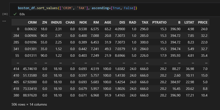 boston_df.sort_values(['CRIM', 'TAX'], ascending=[True, False])