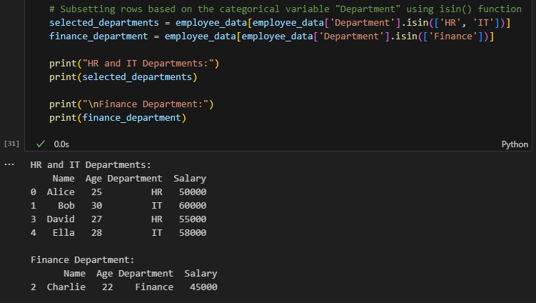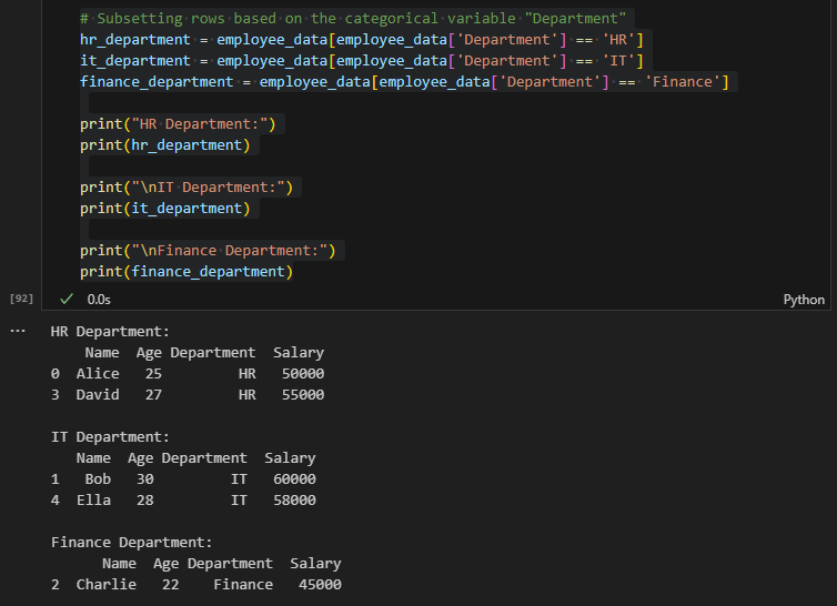 Let's consider a hypothetical dataset called "employee_data" with a categorical variable "Department" and other numerical features. We will use this dataset to subset rows based on the "Department" category.